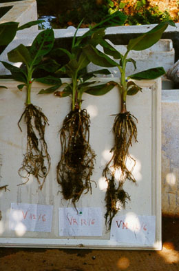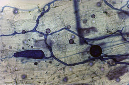 The Farm began researching mycorrhiza in 1996. We worked to isolate and identify mycorrhizal fungi from various regions in Morocco; we also conducted experiments to measure the effect of the mycorrhizal relationship on the performance of several crops, including banana, pineapple, sudan grass and cotton. Although innoculation with mycorrhizae always resulted in improved plant performance and stress resistance, our trials indicate that this increase is not significant enough to make mycorrhiza cost-effective on rich soils. Mycorrhizae are most effective when used for the recovery and rehabilitation of marginal land; they provide significant advanages to young plants in nurseries. The Farm is working to establish an innoculation program for all of our nursery production. Please get in touch if you would like to discuss our work with mycorrhizae.