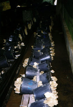 The Farm has produced grey oyster mushrooms (P. ostreatus) and maintains stocks of several other varieties of oyster mushroom (P. pulmonaris, P. eryngii). Production begins by multiplying these cultures in vitro; they are then used to make spawn plugs in order to introduce the culture into the final feeding substrate, usually hay. The hay is kept in anaerobic conditions until the cultures have colonized the substrate. Once the first flush of mushrooms appears, it is critical to maintain the appropriate temperature and humidity to allow them to grow to full size. Please contact us for more information.