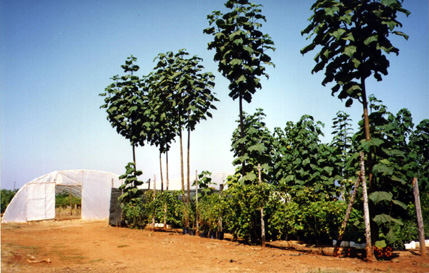 The Paulownia tree provides a unique and ideal solution to this problem. It is a fast growing hardwood tree, capable of attaining a height of 6-7m in the first year. The large leaves, which can attain sizes of up to 80cm in the first year, provide shade and decreased temperature and, once they molt, enrich the soil. The Farm has bred separate varieties of Paulownia adapted for use as ornamentals or in timber production;